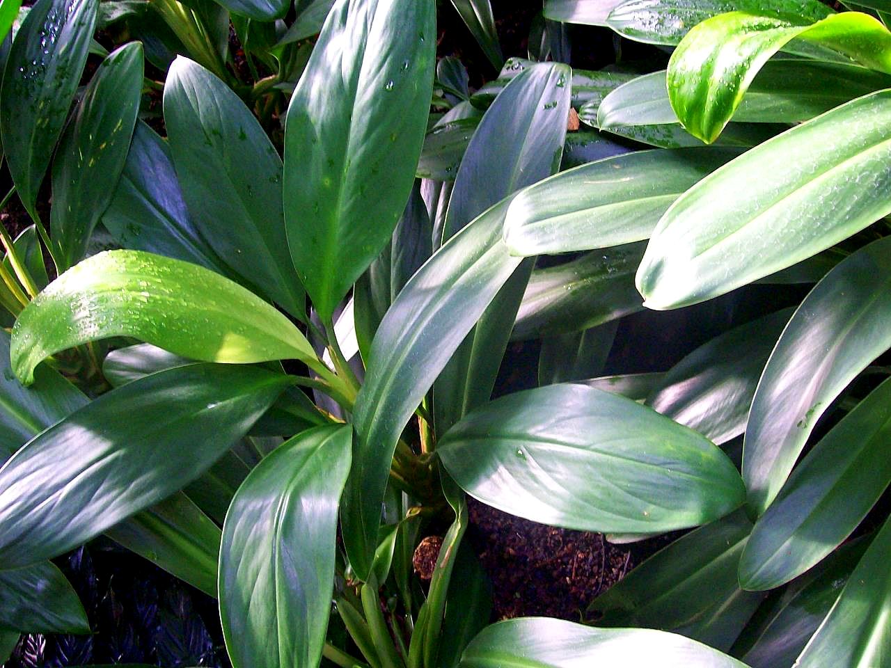 Aglaonema modestum с темно-зелеными без светлых полосок, овальной формы листьями.