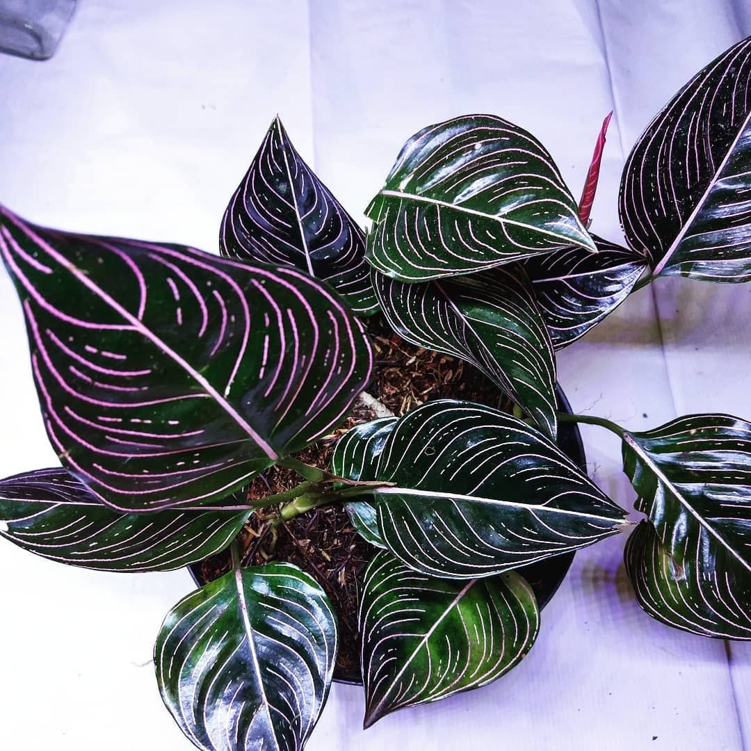 Низкорослый вид с темной листвой имеющей форму заостренного сердца. На темных листовых пластинах красиво выделяются прожилки розового цвета, окраска прожилок может видоизменяться в зависимости от принадлежности к сорту. В зависимости от сорта покрывало початка может иметь белый или слегка розоватый цвет.