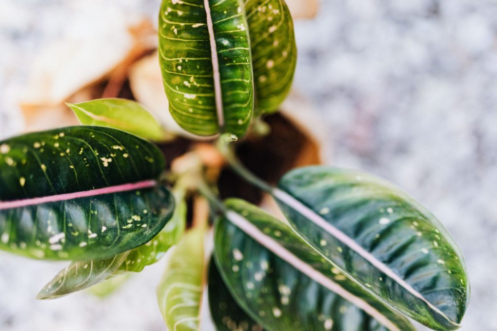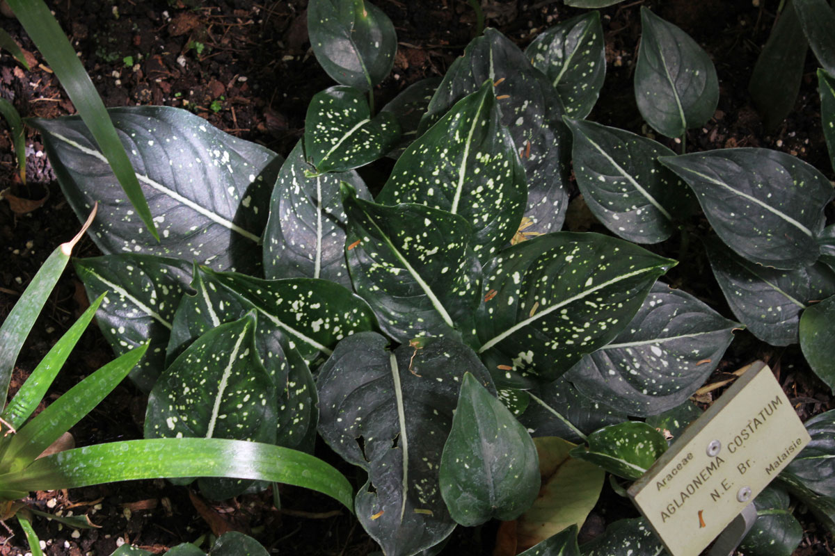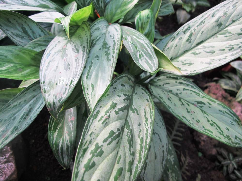 Aglaonema roebelenii с большими серебристыми полосками на листьях.
