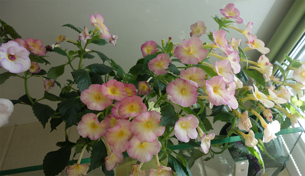 Peach Blossom. Это еще один ампельный сорт ахименеса с бордовыми стеблями. Цветки обладают двойной окраской. Лепестки окрашены в розовый цвет пастельных тонов, а в центре бутона – пятно цвета фуксии.
