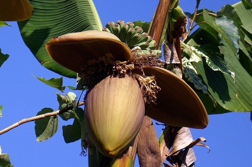 После 8-10 месяцев активного роста банан зацветает кистевидным соцветием фиолетового или зеленого окраса. Цветки трубчатые, состоят из 3 белых лепестков и 6 тычинок. Плоды – ягоды с толстой кожистой оболочкой, развиваются только из женских цветов. Форма удлиненная цилиндрическая или трехгранная, длина 3-40 см, диаметр 2-8 см. Кожура в зависимости от сортовой принадлежности окрашена в зеленый, желтый, красный, серебристый цвет. Мякоть кремовая, оранжевая, розовая, желтоватая, белая. Культурные формы лишены семян, размножаются вегетативно.