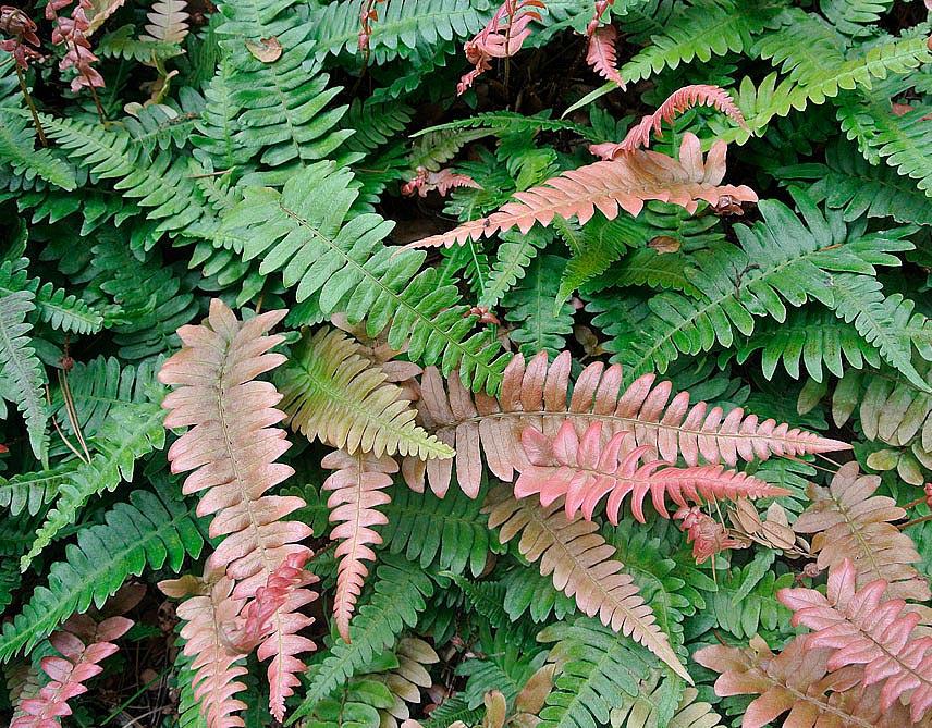 Этот сорт папоротника имеет более широкие листья. Цвет его листвы более светлый, куст невысокий. Молодая зелень имеет розово-оранжевый оттенок и формируется в компактную розетку, напоминающую сердцевину.