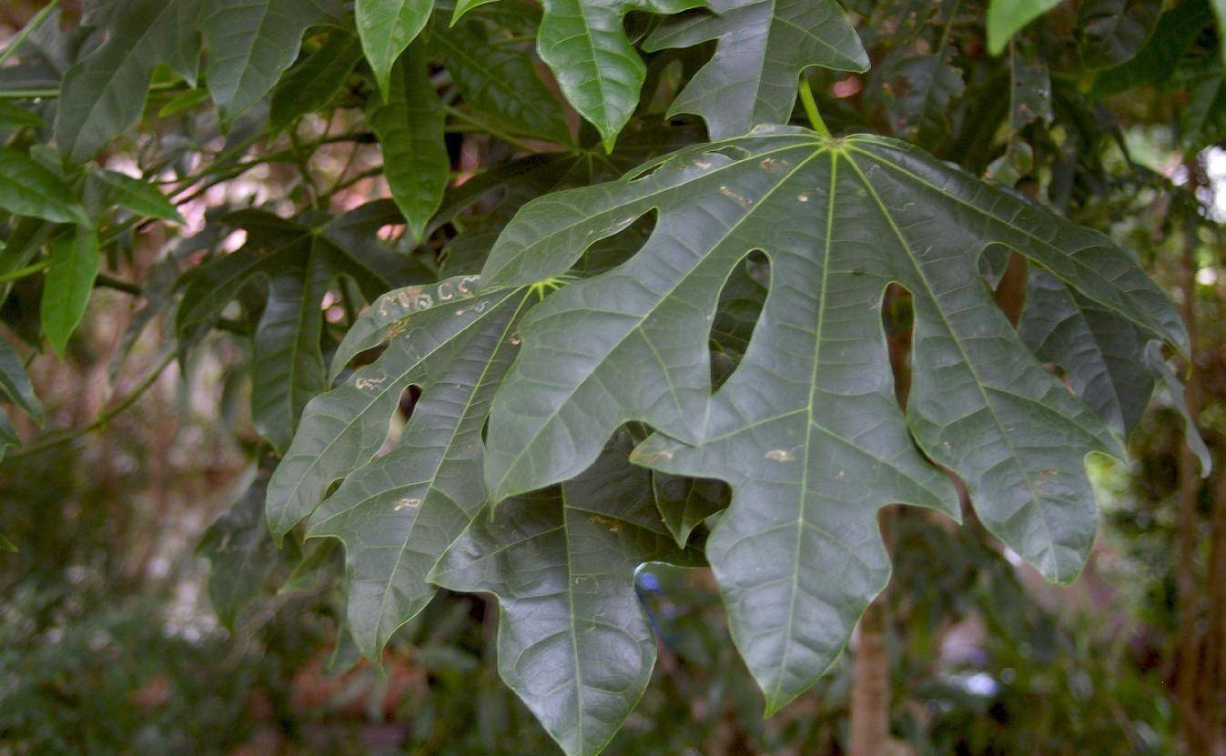 - Кленолистный. Самая распространенная разновидность растения с семидольными листьями зеленого оттенка, которые образуют шарообразную крону. Утолщение на стволовой части выражено достаточно слабо. В летнее время цветет красивыми ярко-красными цветами, собранными в щитовидные соцветия.