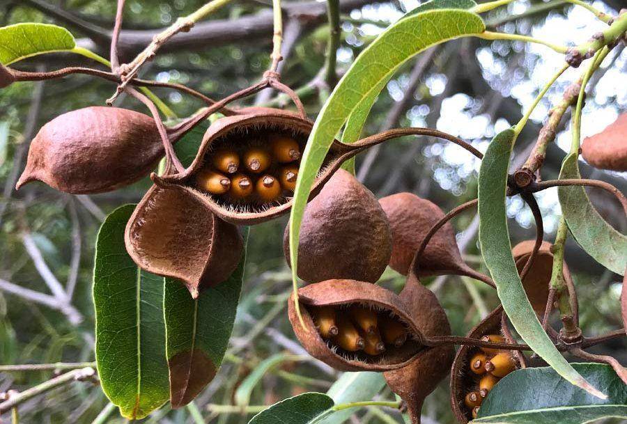 - Разноцветный. Вырастают до 30 м высоту, разветвленные, корона до 15 м в диаметре. Утолщение в прикорневой части ствола может полностью отсутствовать. Листья снизу имеют белесые ворсинки, сверху окрашены в интенсивный зеленый цвет с блестящей поверхностью. Длина одного листа может достигать 20 см. Цветет с ноября и до весны крупными розовыми бутонами с приятным ароматом.