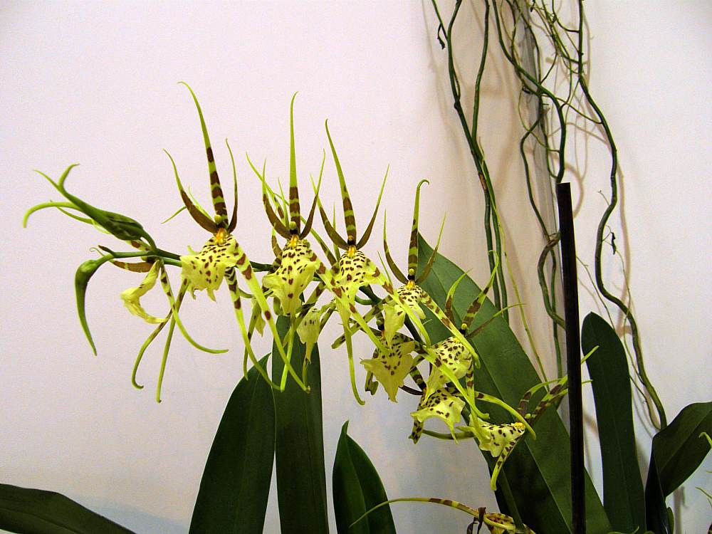 Брассия хвостатая. Длинные неровные стебли несут бледные с желтоватым оттенком цветы. Вступая в фазу цветения, растение наполняет пространство вокруг стойким насыщенным ароматом.