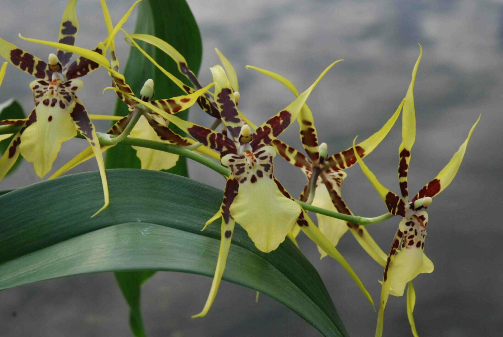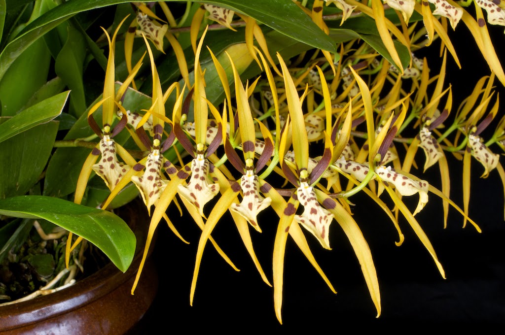 Брассия пятнистая. Выделяется на фоне собратьев крупными пятнистыми бутонами. Ароматные желтые соцветия вкусно пахнут сладкой ванилью.