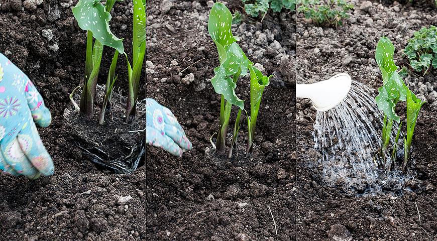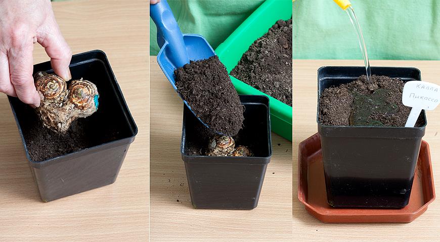 на фото: 1 и 2. посадка клубня в горшок, 3. полив только что посаженного клубня каллы