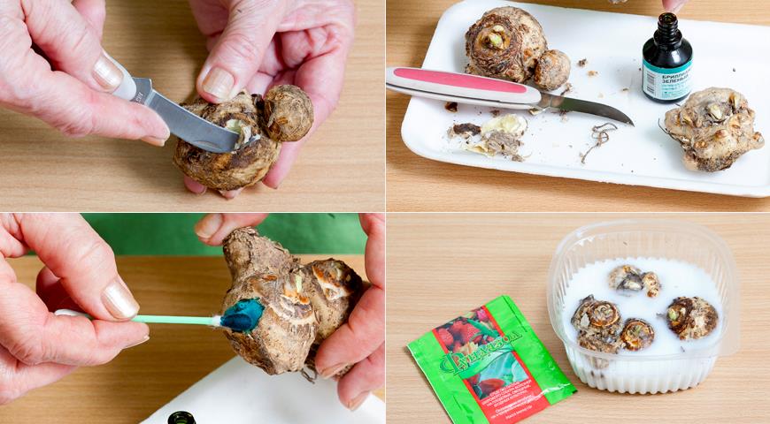 На фото: 1. зачистка раневой поверхности клубня каллы 2 и 3. Обработка раневой поверхности зеленкой 4.обработка клубней калл в фундазоле