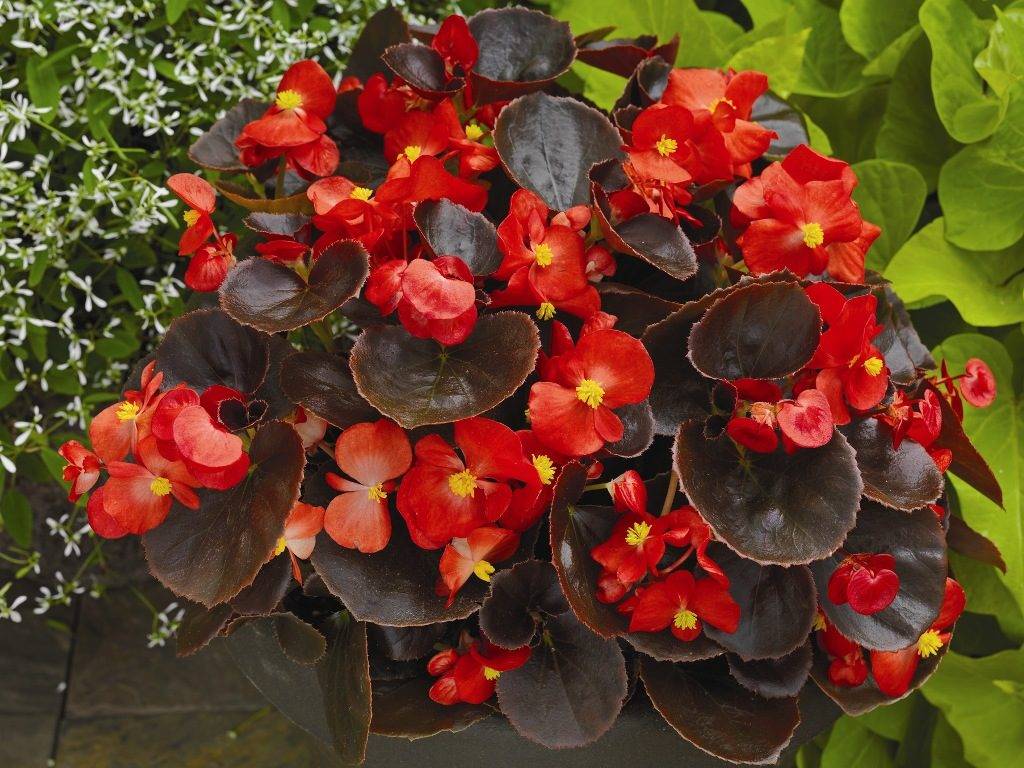Вечноцветущая. Самая популярная среди садоводов бегония, которую можно выращивать как в комнатных условиях, так и в открытом грунте. Растение имеет глянцевые листья зеленых и красных тонов. В домашних условиях этот вид в течение всего года цветет белыми, розовыми или красными мелкими цветочками.