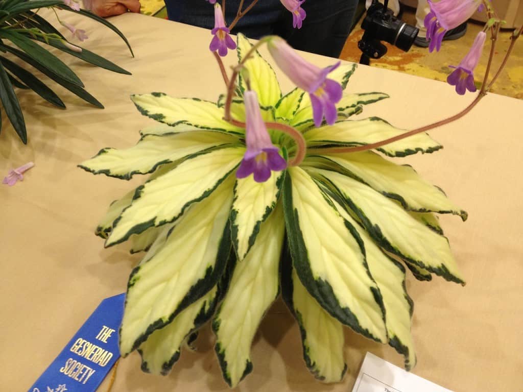 Имеет очень эффектные листья, затейливо раскрашенные золотистыми узорами с розовыми ворсинками. Цветки — нежно-лавандового окраса.