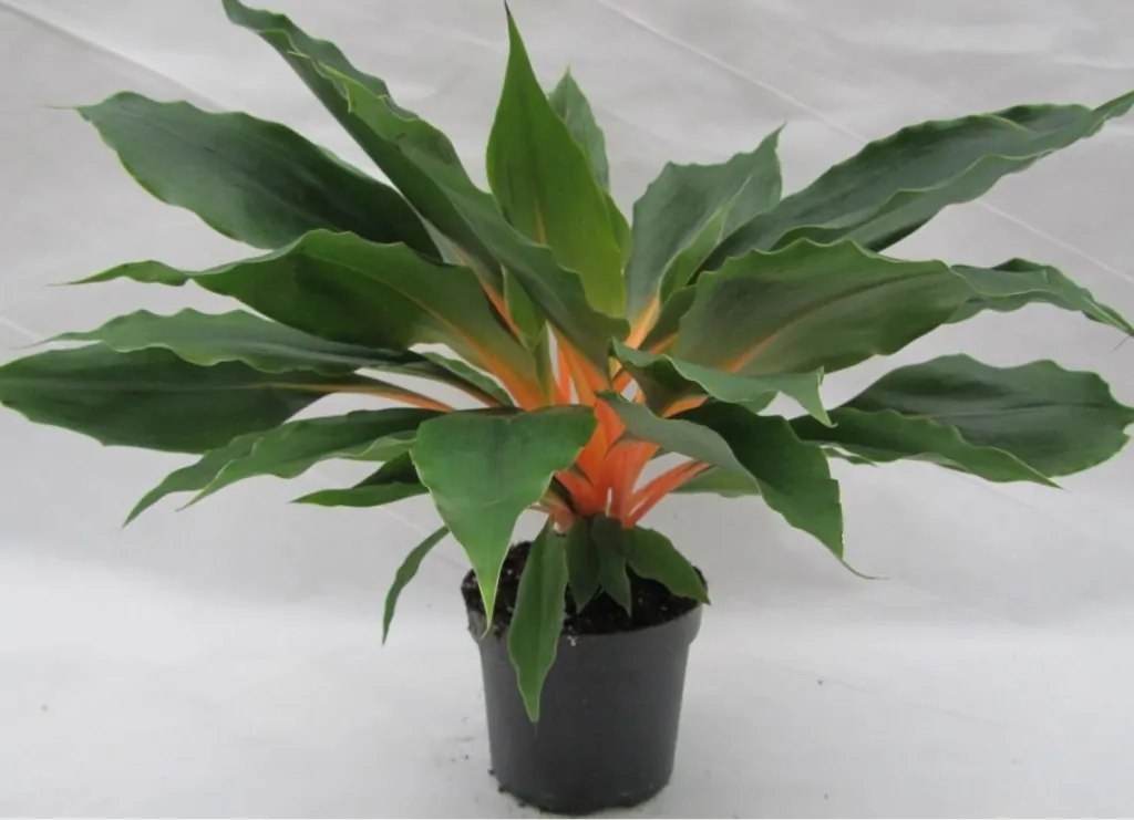 Эллипсовидной формы листья вырастают до полуметра. Эффектный сочный черешок оранжевого цвета переходит в темно-зеленые, глянцевые листья. Стебля нет, у основания формируется розетка из пучков листьев.