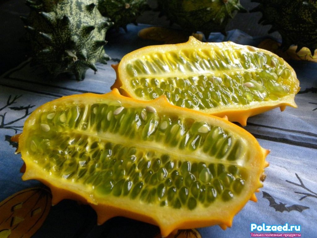 Плод имеет овальную форму, похожую на миниатюрную дыньку. Покрыт толстыми шипами, как у каштана, только мягкими. Мякоть напоминает светло-зеленое желе. Именно в мякоти находятся все семена. Они съедобны и кушать их безопасно. Те, кто употреблял в пищу этот фрукт, знают, что по вкусу напоминает смесь банана с огурцом. Некоторые утверждают, что по вкусовым качествам схож с дыней и лаймом. В общем, мнения разнятся. Но точно установлено, что он обладает сладковатым вкусом с приятной кислинкой, дающей освежающий эффект. Кушать этот фрукт стоит ложкой, после разрезания его пополам. Что касается калорийности, то она небольшая: на 100 г продукта приходится всего 44 ккал. Его питательная ценность: белки — 2,2 %, жиры – 2 %, углеводы – 5,94 %, пищевые волокна – 0 %, вода – 0 %.