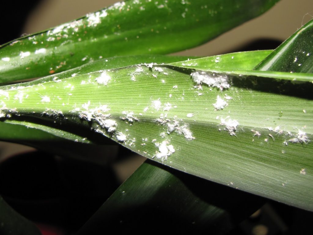 Белый налет на листья и побегах – основной симптом поражения мучнистым червецом.
