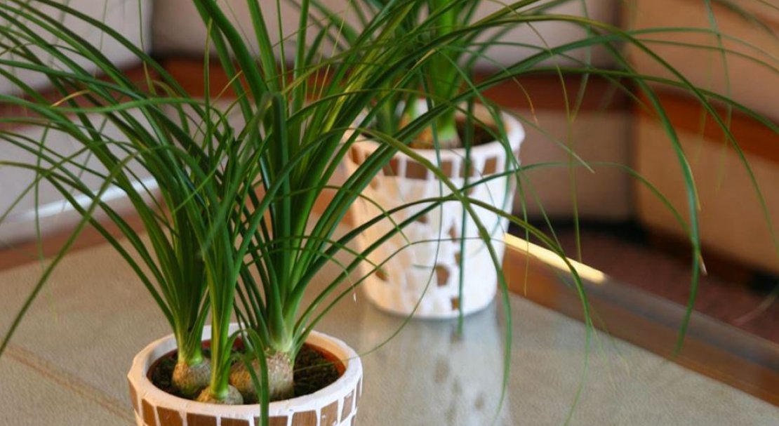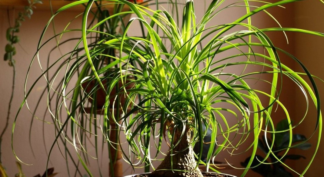 В домашних условиях выращивают цветок «конский хвост» вида Бокарнея отогнутая. Луковицеобразное утолщение в нижней части ствола придает основе форму бутылки от шампанского. Крона густая, очень пышная, состоит из тонких, длинных листьев, ниспадающих по сторонам из центральной части. В домашних условиях Нолина отогнутая вырастает до полутора метров, длина листьев – до 1 м.