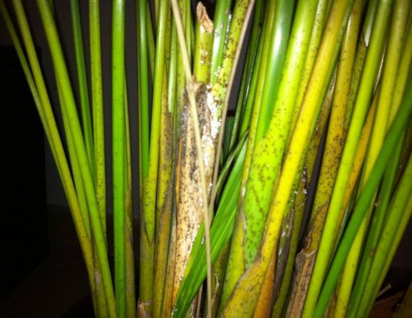 Также атаковать пальму могут вредители, представленные червцами, тлей, щитовкой и паутинными клещами, питающимися соком листовых пластин культуры. Избавиться от них можно при помощи обработки трахикарпуса инсектицидом «Актеллик» согласно инструкции на упаковке.