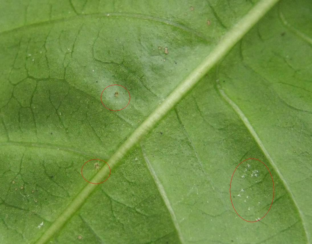 можно обнаружить, только когда колонии насекомых достигают внушительных размеров. А также по характерному признаку — появление около черенков листьев и внизу листа паутинок.