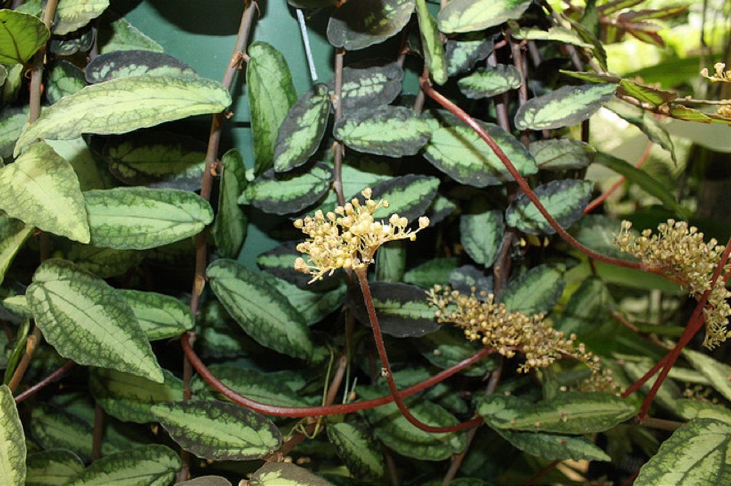 Пеллиония ползучая. Растение имеет мясистые, ползучие стебли, способные цепляться за скалы и стены, а также подниматься на высоту до 50 см. Овальные листья достигают в длину 4-5 см и имеют плотную структуру, похожую на бумагу. Середина листа более светлая, салатовая, а края покрыты бронзово-зелеными разводами.