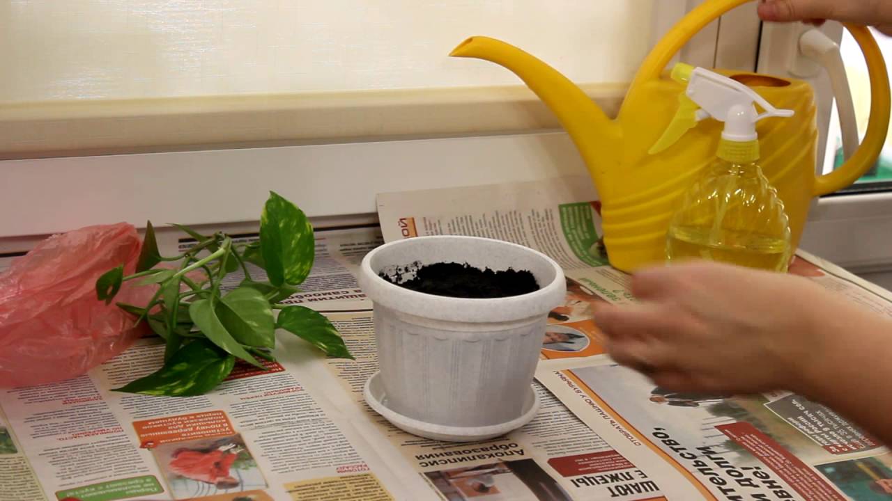 Разместите цветок по центру и постепенно заполните оставшееся пространство субстратом. Перед процедурой сильно отросшие стебли эпипремнума лучше укоротить.