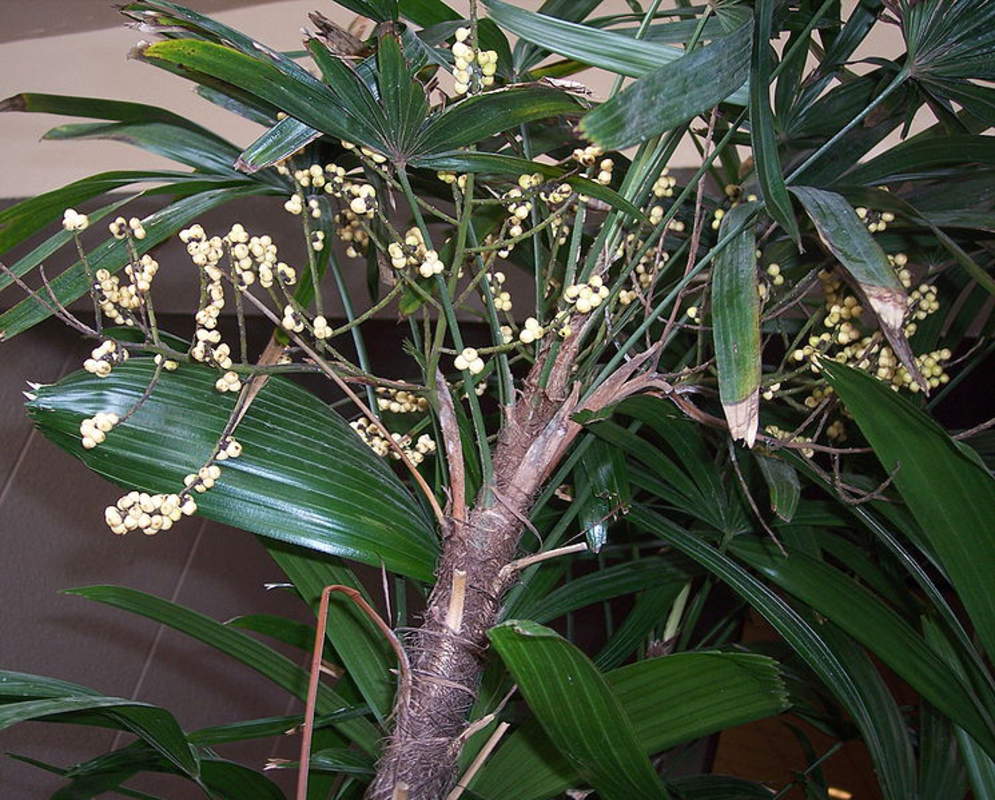 Rhapis excelsa является двудомным растением. Но у женских и мужских особей внешние различия отсутствуют. Располагающиеся на пальме рапис мясистые цветки – 3-лепестковые, белые. Они образуют на верху кроны по спирали небольшие соцветия. Плоды рапис пальмы несъедобны.