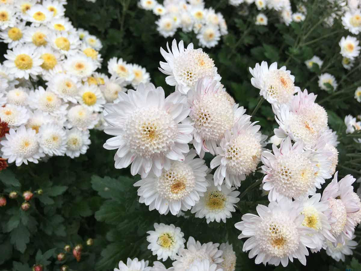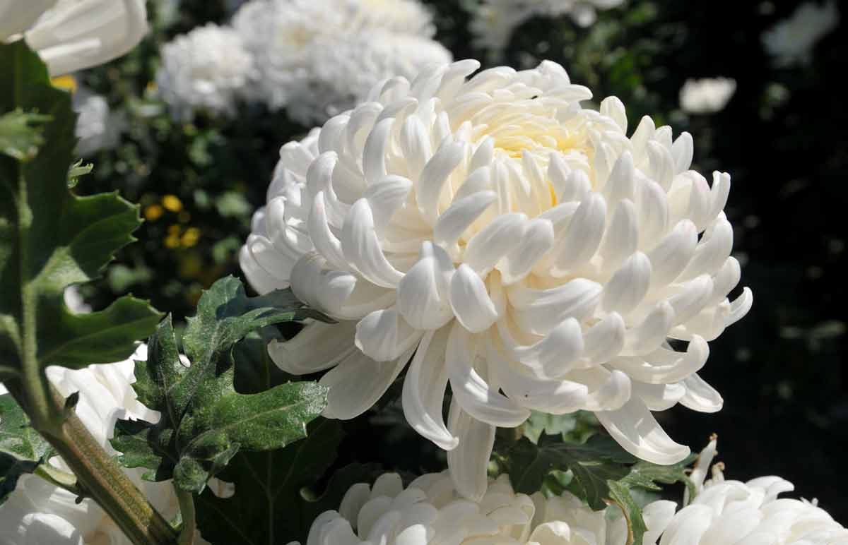 Хризантема «Первый снег». Высота куста бывает до 35 см, в ширину он – до полуметра. Куст объемный, но крепкий, не разваливается. Цветет крупными, до 5 см. в диаметре, полумахровыми цветами ярко белого цвета со второй половины августа дней 30 — 40.