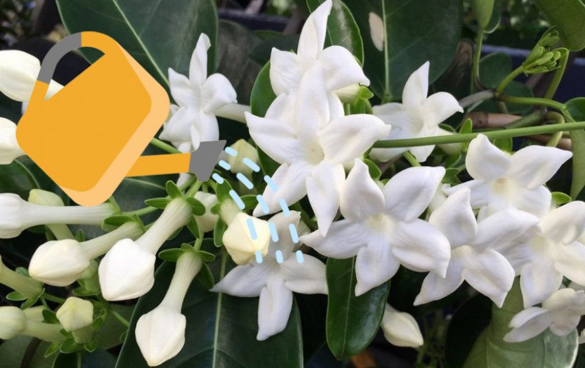 Уход за комнатным жасмином предполагает ежедневное опрыскивание в летние месяцы. Вода должна быть теплой, с минимальным количеством солей, можно дистиллированная.