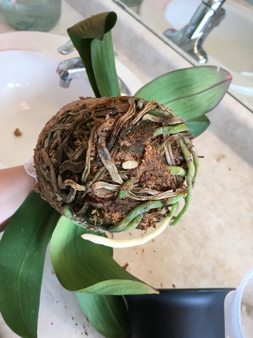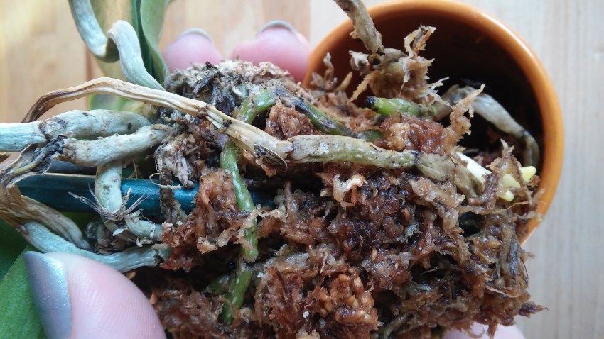 - В первую очередь необходимо полностью просушить субстрат, в котором растет орхидея.