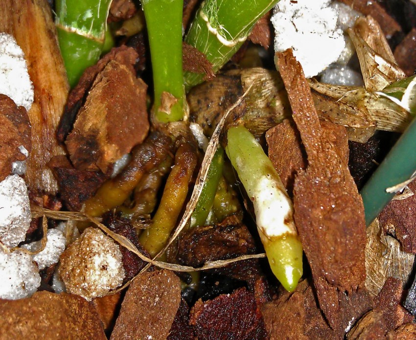Корни орхидеи могут поражаться не только плесневыми грибками, но и бактериальной гнилью, которая не образует на поверхности корешков белого налета или пятен.