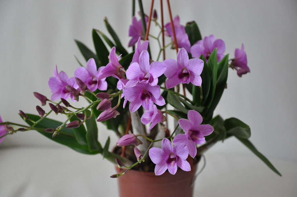 Дендробиум. Достаточно компактная орхидея. Сиреневые орхидеи Дендробиум – это эпифитные и литофитные одновременно цветы. Эпифитная форма преобладает. В природе подобные растения крепятся к деревьям, их корням или ветвям, при этом не паразитируя их. Побеги орхидеи фиолетовой прямостоячие, но со временем переходят к стелющейся форме. У основания листья не собраны в розетки, а растут по всему стеблю, могут также располагаться в верхней его части. Форма листьев — растянутый эллипс, фактура листа плотная. На каждом цветоносе, которые появляются из пазух листов, формируется по 4 цветка размером до 8 сантиметров.