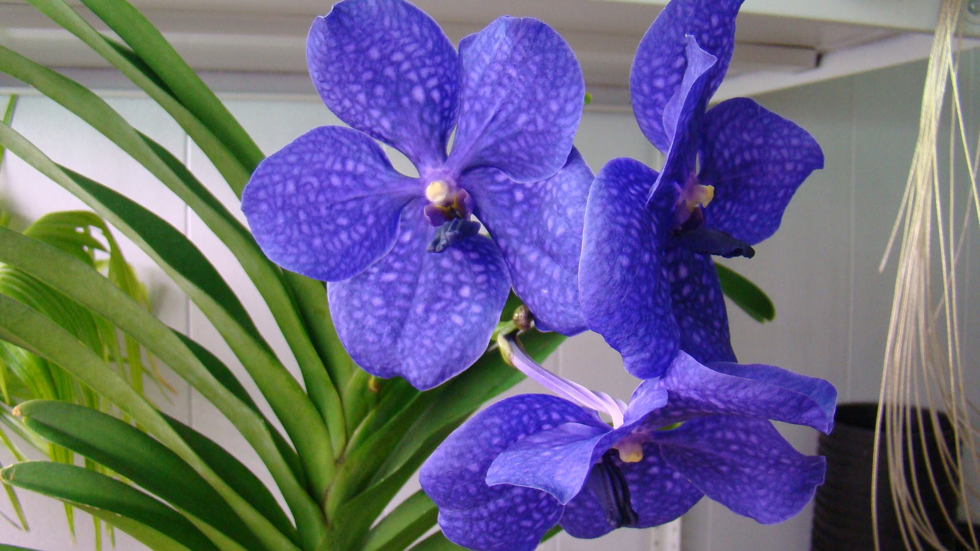 Расположенные в два ряда кожистые листья и до двадцати цветков с голубыми лепестками в сеточку делают ее сказочно красивой. Особенно впечатляюще смотрится, если ее располагать в стеклянных вазах или использовать в качестве ампельного растения. Свой вклад в общую картину композиции вносят и свисающие воздушные корни. Недаром она самая известная орхидея из рода Ванда, именно она стала прародительницей многих видов гибридов с экзотической окраской.