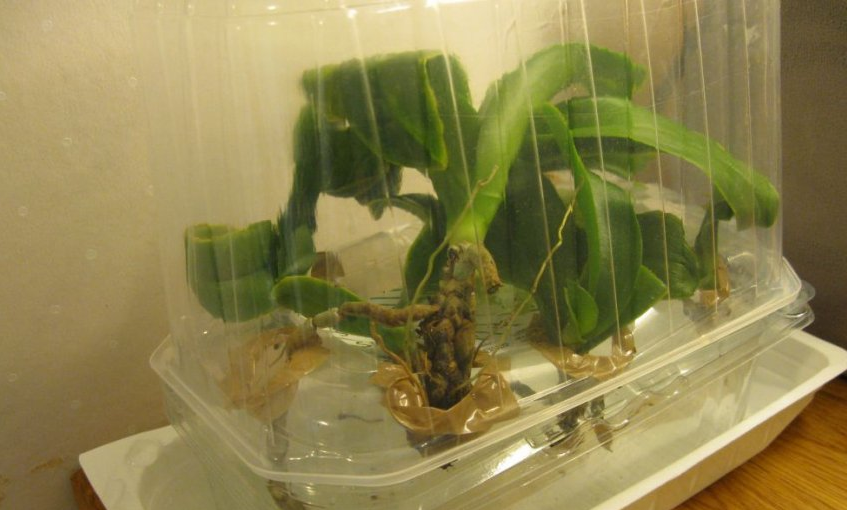 В укрытии цветку предстоит быть до тех пор, пока не произойдет наращивание корней у орхидеи до 3-5 см. Для ускорения регулярно проводят стимуляцию роста. Субстрат увлажняют по требованию, теплицу проветривают.