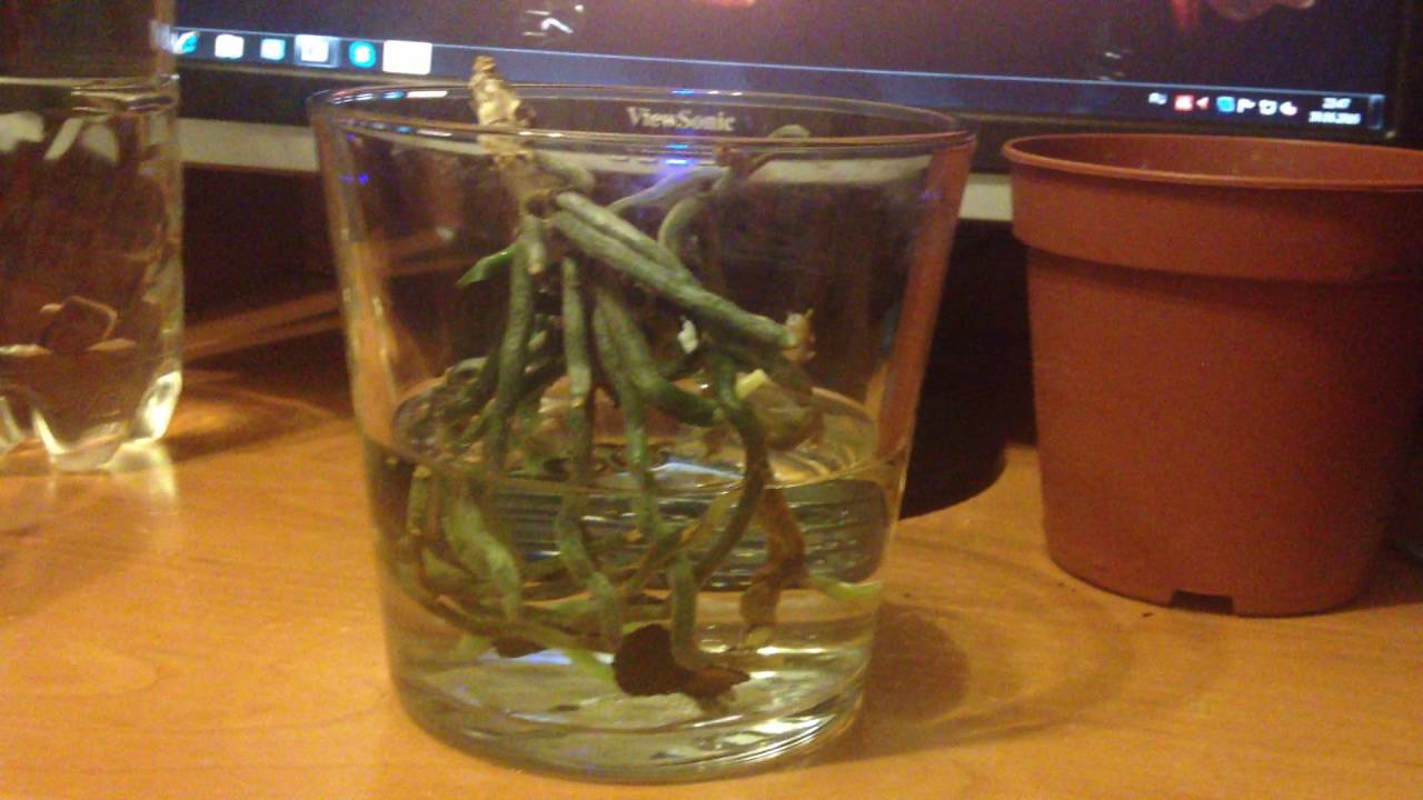 В этом случае удаляются все сгнившие корешки. Делается это при помощи предварительно продезинфицированных ножниц. Затем растение устанавливается в воду так, чтобы верхняя ее часть возвышалась над водой. Нужно перенести емкость с орхидеей в хорошо освещенное место. Так орхидея начнет восстанавливаться, и вскоре должна появиться новая корневая система.