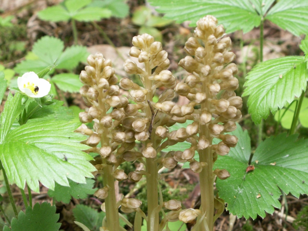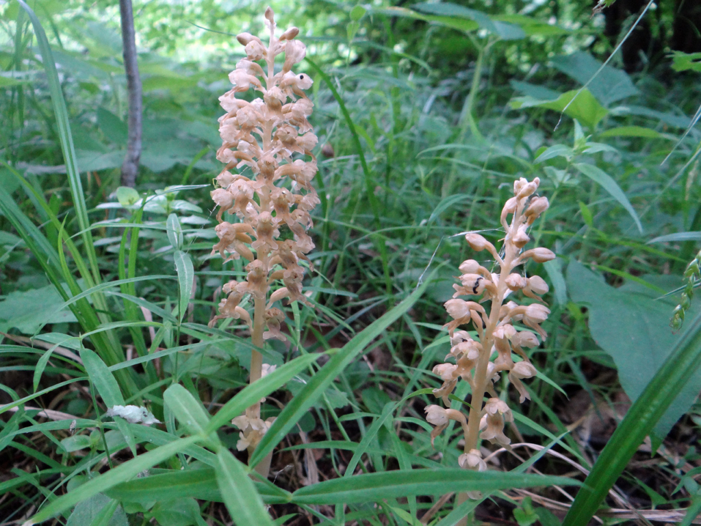 Еще одна лесная орхидея – любка двулистная. Цветущее растение имеет очень изящный вид. На тонком стебле находится колос из белых цветков. У самой земли находится два листа друг напротив друга. По ним можно узнать растение даже когда оно не цветет. Стоит отметить, что экземпляры с двумя листочками – цветущие, а те, что имеют только один прикорневой лист – нецветущие. Во время цветения любка двулистная источает потрясающий аромат, который особенно силен в утренние и вечерние часы. За это в народе растение получило название – ночная фиалка, хотя к самим фиалкам никакого отношения не имеет.