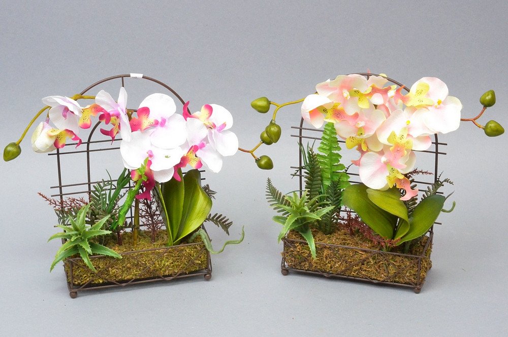 Многие хозяйки изготавливают контейнеры для орхидей своими руками и помещают в них пластиковые или керамические горшки. Такое решение выглядит необычно и стильно. При этом используются палочки из бамбука или дерева, скрепляемые медной проволокой или почти невидимой леской.