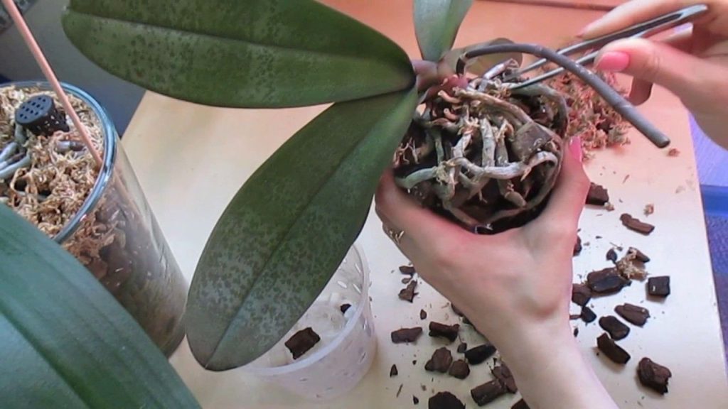 Орхидею освободить от предыдущего горшка аккуратно, можно даже разрезать горшок. Удалить сгнившие корни и поместить в новый горшок, засыпая его субстратом.
