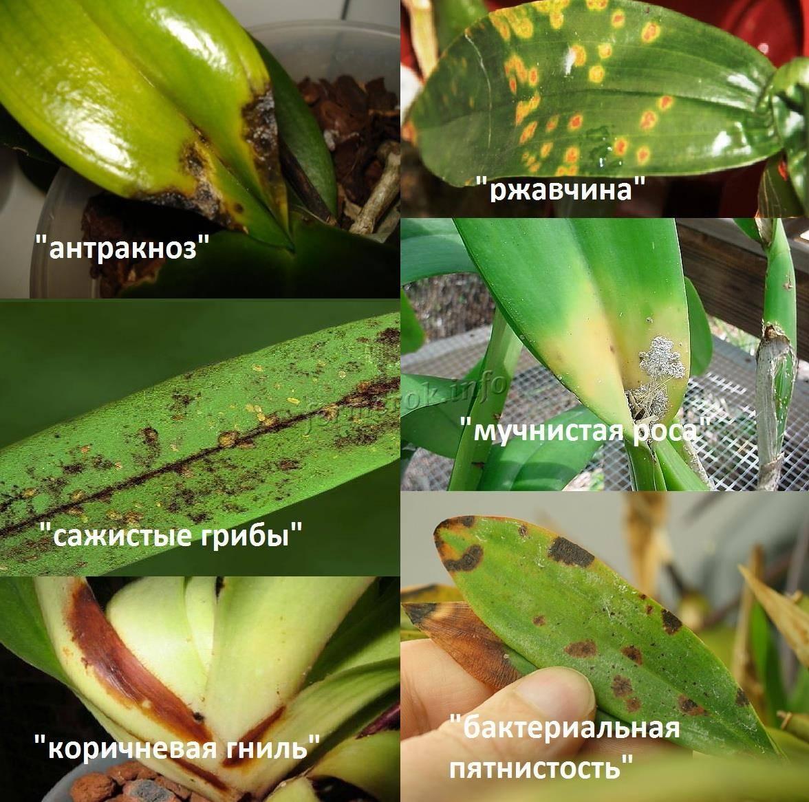 Орхидеи при неправильном уходе подвержены различным заболеваниям. Чаще всего причина лежит в переувлажнении почвы. Это благоприятствует разнообразным грибковым заболеваниям. Корни гниют, инфекция распространяется дальше, вызывая недостаток питательных веществ. Самые распространенные из грибков бактериальная пятнистость, антракоз, мучнистая роса, серая гниль. Вирусные инфекции орхидей достаточно редки. Мозаичная пятнистость листьев иногда поражает фаленопсис, цимбидиум.