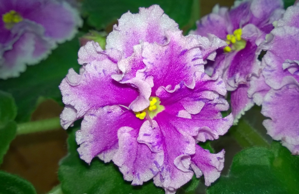 Край лепестков сильно бахромчатый. Листья фестончатые, насыщенно-зеленые. Пластинка жесткая. Розетка небольшая. Богатое продолжительное цветение. Чем ниже температура, тем светлее цветки.