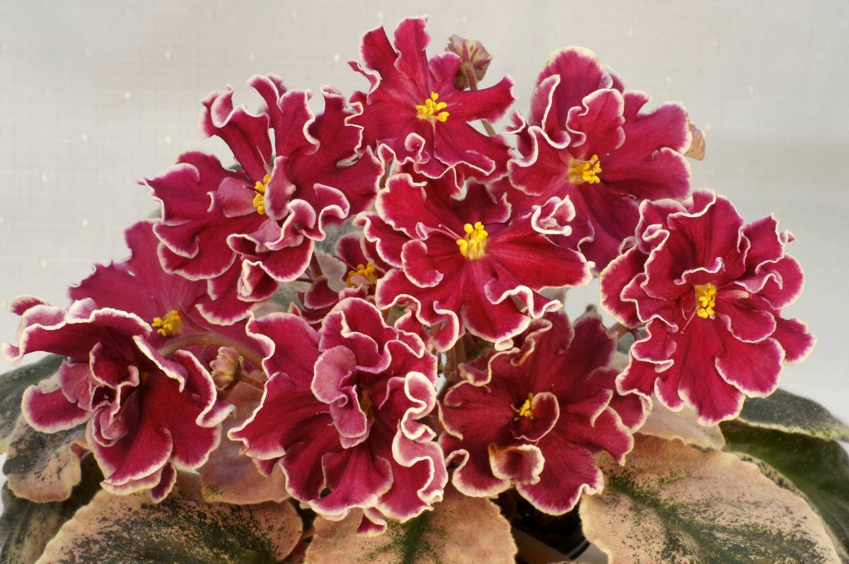 Крупный сорт с темно-красным соцветием. По краям белая волнистая окантовка с легкой зеленцой. Пестролистник выставочный темно-зеленый с заостренными зубчатыми листьями.