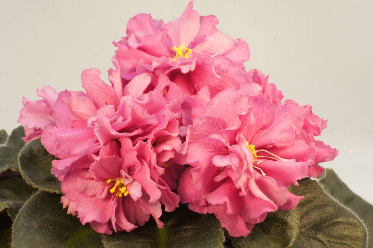 Фиалка ЕК представлена с розовым соцветием. Поверхность махровая. Присутствуют зеленые наружные лепестки. Цветет обильными и красивыми гроздьями. Листья фиалки насыщенно-зеленые.