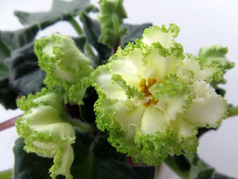 Окраска листьев сенполии зависит от условий содержания. А вот окрас гофрированного края лепестков бутонов должен соответствовать стандарту – быть нежно-зелёным. Розоватый край указывает, что цветок принадлежит к подвиду сорта или так называемому спорту.