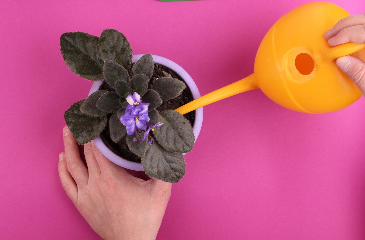 Для лучшего впитывания и распределения влаги полив лучше производить нижним способом. В этом случае горшки с фиалками ставят в большую ёмкость с тёплой водой, так она будет впитываться до нужного уровня. Убирать горшки с растением нужно, когда станет видно влажность на поверхностном слое.