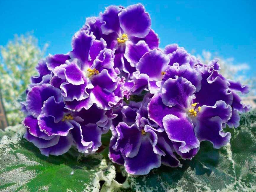 Цветы махровые с бархатистыми лепестками, иногда на розетке бывают и полумахровые цветы. Края лепестков волнистые, что придает дополнительный объем цветку. Цветет практически постоянно.