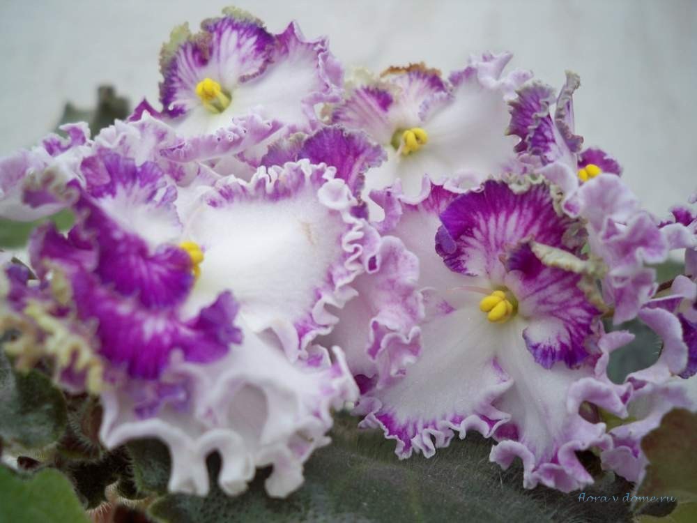 сорт с сильно гофрированными чашевидными цветами белоснежного цвета, края лепестков которых имеют розовый или сиреневый оттенок. Встречаются махровые и полумахровые фиалки. Листья розетки волнистые, отличаются выраженной пестролистностью.