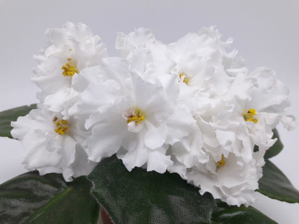 Является фаворитом среди белых сенполий. Имеет белоснежные цветы, похожие на помпоны, диаметр которых до 7.5 см. Розетка крупная. Листья с заострённой формой, средне-зеленые, поверхность которых блестящая. Сорта Белой королевы могут иметь и розовые оттенки цветов (ЕК-Шармель).