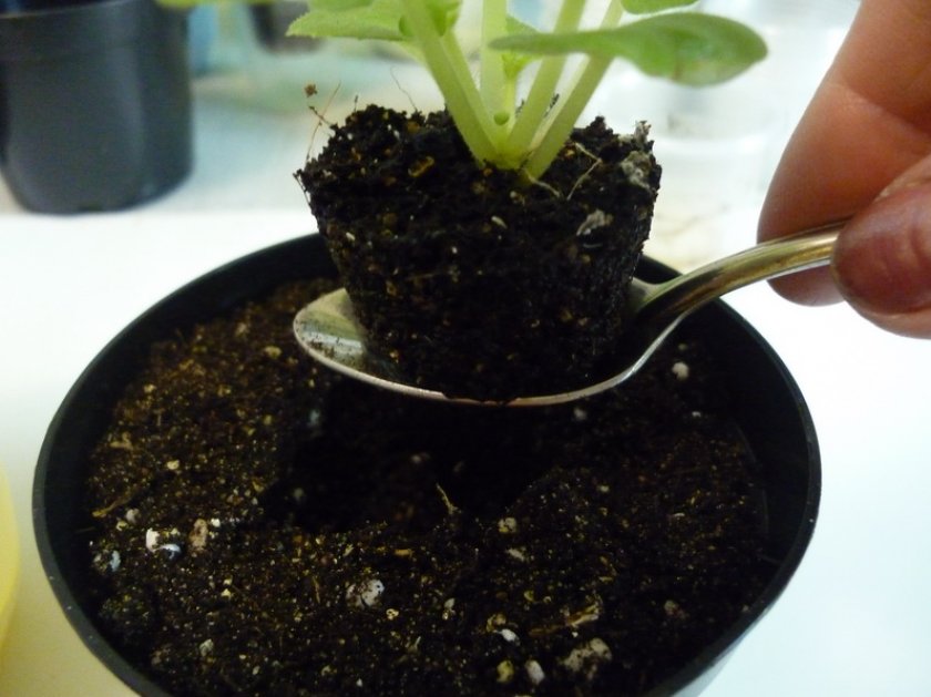 - Засыпьте фиалку оставшейся почвенной смесью до уровня нижних листьев, а через сутки полейте водой и при необходимости досыпьте грунт.