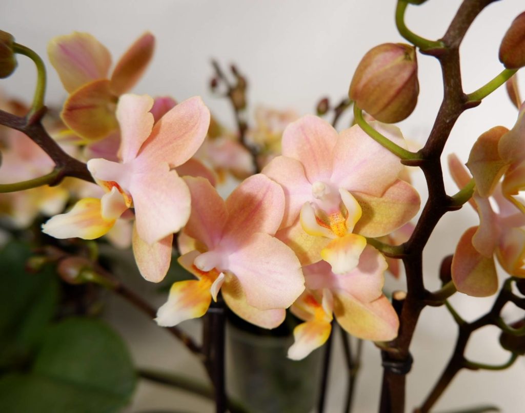 Фаленопсис радует глаз бутонами насыщенных пастельных оттенков – персикового, розового, пудрового или оранжевого-малинового. Аромат нельзя четко разложить на составляющие. В целом его можно охарактеризовать как цветочные духи с нотками жасмина и цитруса. Растение любит находиться под ярким рассеянным освещением до 16 часов в сутки.