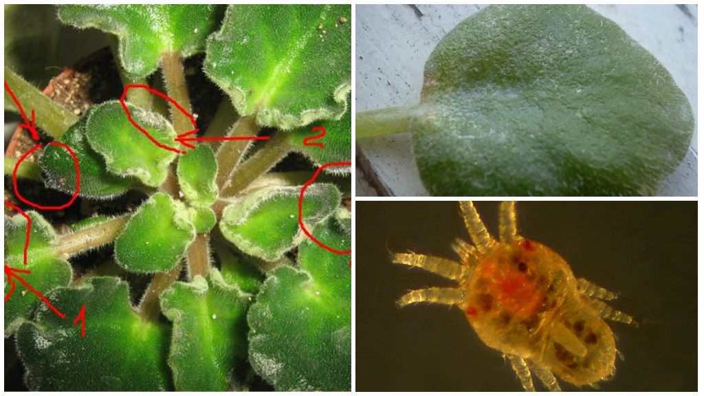 Определить, что на комнатных растениях поселились паразиты, можно по следующим внешним признакам (см. фото клещей на фиалках):