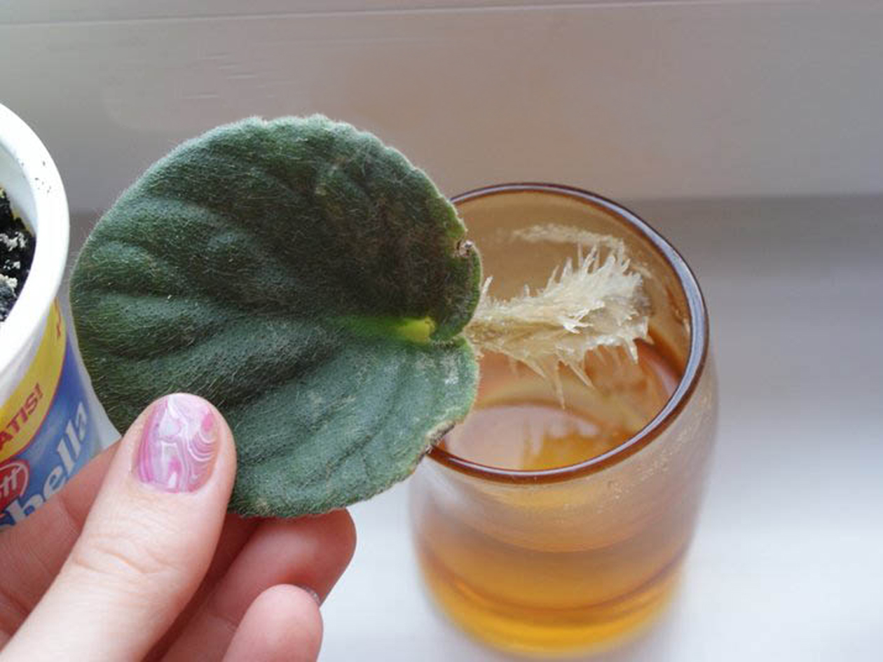 - В стеклянную емкость наливают отстоянную воду и фиксируют в ней черенок таким образом, чтобы в воде находилась только нижняя часть черешка, а лист был над емкостью.