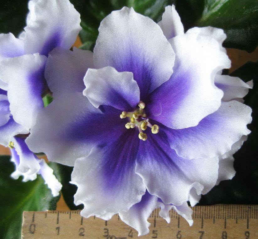 Венчик фиалки бывает немного похож на ромашку с бело-голубыми лепестками. Структура у лепестков лёгкая, светящаяся, с абсолютно ровными контурами.