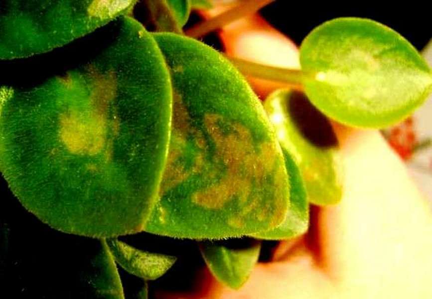 Из-за неправильного ухода за фиалкой на ее лиственном покрове могут появиться коричневые, темно-фиолетовые или светлые пятна.